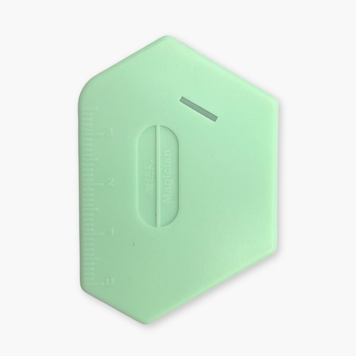 Esta guía con imán es de plástico duro. En la parte inferior tiene un imán rodeado de una goma rosa que evita que nuestra máquina se raye al mover el imán.