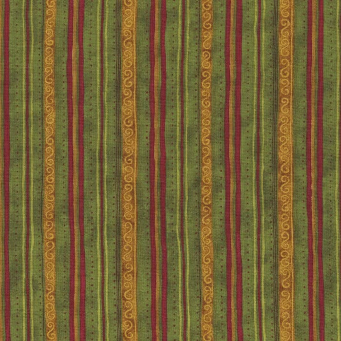 Tela colección Star of Wonder . Star of Light de Nancy Halvorsen – motivos rayas verdes y doradascon pequeños adornos de volutas en fondo rojo Ref.MP17066-10
